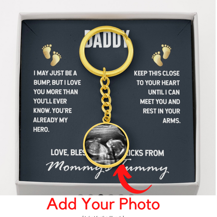 Message Card Reads: I may just be a bump, but I love you more than you'll ever know. You're already my hero. Keep this close to your heart, until I can meet you and rest in your arms. Love, Blessings and Kicks, From Mommy's Tummy